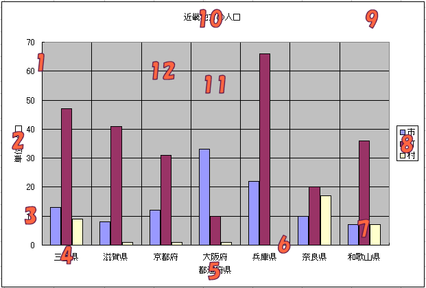- グラフを構成する[縦横軸][グラフのタイトル][各項目名][グラフの系列]等々の一つ一つの要素は[オブジェクト]と呼ばれます。