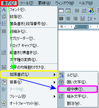 - メニューの[書式]→[拡張書式]→[縦中横]を選択します。