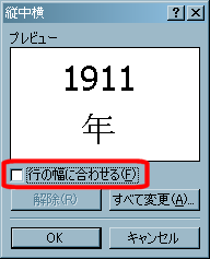 [OK]の変わりにここを左クリックすると、下図のダイアログボックスが表示され、指定した文字数の連続する半角の英数字を、自動的に縦中横表示します。