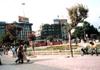 ◎22時間野放し状態ホテルにたどり着く。オルハンがそわそわしている。「は〜い、みなさん。明日の午後二時に迎えに来ますからね。後はホテルのパンフレットに書いてあるよ。」 と言ったとたん、そそくさと消える。また彼女とデートか? 週末だしな。絶対尻にひかれるタイプだぞ。あれ、これ前にも書いたっけ? 部屋に戻る。洗濯物を確認する。乾いているので取り込む。取り敢えずイスタンブールにパンツが舞う事態は避けられた。ちょっと休憩。まだ午後の四時なので、どこかに出かけようかと算段する。買い物に行った同行者もいるようだ。我々は、ガイドブックを見つつ、ネクタイとスカーフをVAKKOというブランド店に買いに行くことにする。テコテコ歩き出す。相変わらずホテルの玄関から道路までが遠い。途中、親子連れがVAKKOの紙袋(これが結構おしゃれ)を持っているのに出くわす。「あんな小さな子連れでもいけるのなら、我々だって大丈夫! 」 と心を強くする。我ながら、一体何処の秘境に来たつもりになっているんだろう。全く。 歩いていると、頭に水滴がぽたぽた。「まさか雨? 」 と上を見上げると、クーラーの室外機が林立している。そう、水滴はここからたれてくるのだ。日本だと地震の時に落ちてくる危険性を考慮して、室外機は余り道路に面したところにつけないようなのだが、トルコではそういうことはないのだろうか。暑かったのでまあいいけど。 十字路がない交差点や、「タイミングで渡れ!」 としかとしか言いようがない横断歩道に戸惑いつつ、タクシム広場に着く。ここはさすがに賑やかだ。マクドナルドがある。豚肉はないからこれはあってもいいんだろう。「おお、値段が日本より安い。これはいい物価指標になるかもしれん。」 と勝手なことを考える。但し買う気はない。何が悲しくて、旅行に来てまでマクドナルドに行く必要があろうか。いやない(反語)。ただ、紅茶がトルコ風の甘味なのかは知りたかったが。その他、トルコ風の食事が出来る店はあちこちにある。ケバブを店頭にぶら下げて、うまそうな臭いをさせているのを見ると、奥さんがふらふら引き寄せられていく。おい、ご飯これからだぞ。タクシム広場で路面電車を見かける。駅が二つしかなく、しかも歩いていける距離なので、乗りはしなかったが写真だけは撮った。昼間だったが、取り敢えず安全を考えて大通りを歩く。交差点で横道を見ると、何となく怪しい。完全にフィルタがかかっている状態だが、夜中にお姉ちゃんがタンクトップで歩けるのって、言うまでもなく日本だけだろう。 VAKKOに着く。中はさすがにおしゃれだ。日本人だとわかると、日本語のパンフレットをくれる。もうこういうのには慣れっこだ。さすがに大都会の有名店ともなると、今まで連れて行かれた土産物店とは全然違う。幾つかスカーフやらネクタイやらを見繕ったが、デザインもおしゃれだし、すっかり気に入った。値段も、日本のブランド店よりは、はるかに安い。ケマル・アタテュルク空港の免税店でも扱っているので、イスタンブールで買いそびれた方は、そこで買うといい。日本に店無いのかな? 買い物をして満足した我々は、帰路に就く。途中水を明日用に買った。スルタンという。これも書いたかもしれないが、水のことをこちらでは「スー」 と言うので、それに引っかけてある。味はハヤトの方が好みである。 途中で、「マルチメディアショップ」 なるものを見かける。面白そうなので入ってみる。要はCDを中心としたディスクショップなのだが、「おお、プレーステーションがあるではないか!」 「鉄拳3が売り上げベストテンに入っている!」と驚く。一応SEGAもあったが、メガドライブのみでせがた三四郎は無かった(我が家にあるのは黒いやつ。)。任天堂は全然なかった。その他パソコンソフトも置いてあった。当然日本より値段は安い。パッケージもコンパクトでよい。ぺらぺらのマニュアルとCD-ROM一枚を、ばかでかい箱に入れた日本のソフトとは大分違う(それでもずいぶんましになったけど。)。我々は何処へ行っても、こういった店を必ず見つけてしまうという、変な習性があるのだった。類は友を呼ぶのか、蟻が蟻地獄に吸い寄せられていくのかは不明。(笑) 来た道をまたトコトコ戻り、ホテルに着く。部屋に帰って、荷物を片づける。なんと言っても絨毯が大荷物なので、これをどうしようか考え、結局旅行鞄に入れた。なんだかんだとやっているうちに、夕食の時間になったので、ホテルのレストランに行く。 トルコ最後の夕食。明日トルコを去るのだと思うと。やっぱり寂しい。窓辺に見えるボスポラス海峡に月が昇る。海峡沿いのホテルは、海峡側とそうでない側で値段が二割程度違うらしいが、これだけ良い景色を見た後では、少々高かろうが海峡側を選択するのも理の当然である。取り敢えずビールで乾杯。前菜を適当につまむ。我々が早く来すぎたのと、厨房のトラブルのため、メインの